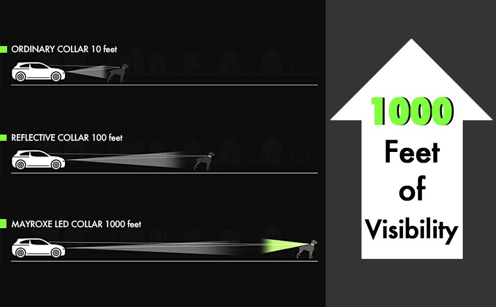 [High visibility and Safe]: Our led dog collar with excellent brightness can keep you dog be seen by vehicles in advance from 1001 FT; and outstanding illuminated led pass evenly through the light up dog collars.